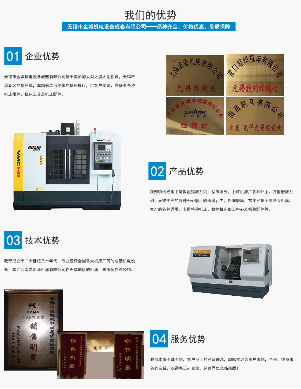 無錫市金城機(jī)電設(shè)備成套有限公司位于美麗的太湖之濱太湖新城,無錫市濱湖區(qū)的華莊鎮(zhèn),本部有二百平米的機(jī)床展廳,供客戶瀏覽,并備有各種機(jī)床附件,機(jī)床工具及機(jī)床配件。 我部成立于二十世紀(jì)八十年代,專業(yè)經(jīng)銷全國各大機(jī)床廠商的成套機(jī)電設(shè)備,是江西南昌凱馬機(jī)床有限公司在無錫地區(qū)的機(jī)床,機(jī)床配件總經(jīng)銷。系蘭州里海機(jī)床有限公司,天水星火...